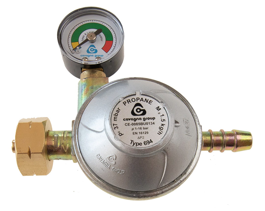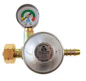 Reduktor gazowy na butle 11 kg z zaworem bezpieczeństwa i manometrem. Ciśnienie 37mbar, wydajność 1,5kg/h. Główną zaletą urządzenia jest informowanie o niskim poziomie gazu w butli.