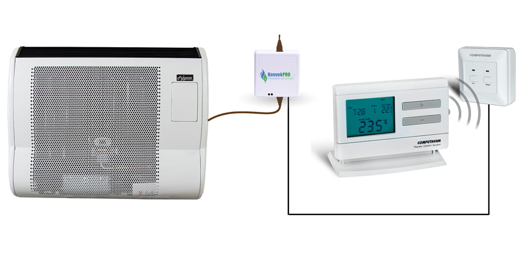 Gdy temperatura w pomieszczeniu spadnie poniżej wartości ustawionej na termostacie pokojowym, KonvekPRO na podstawie sygnału otrzymanego z termostatu pokojowego przestaje grzać termostat rurowy ogrzewacza gazowego, który stygnie (przez 3-6 minut) poniżej temperatury ustawionej pokrętłem regulacyjnym ogrzewacza gazowego tak, aby ogrzewacz gazowy włączył się i zaczął grzać. Gdy temperatura w pomieszczeniu osiągnie wartość ustawioną na termostacie pokojowym to termostat pokojowy wysyła sygnał do KonvekPRO, aby nagrzał (przez 1-1,5 minuty) termostat rurowy powyżej wartości ustawionej pokrętłem regulacyjnym ogrzewacza gazowego i ogrzewacz gazowy przestaje grzać.Za pomocą KonvekPRO można łatwo ustawić automatyczny programowany system ogrzewania w pomieszczeniu grzanym przez ogrzewacz. Poza tym ten produkt umożliwia zdalne sterowanie nagrzewnicami gazowymi za pomocą termostatu Wi-Fi. Dzięki temu produktowi możesz zaoszczędzić znaczną ilość energii, a także poprawić komfort. Zaprojektowaliśmy KonvekPRO tylko dla ogrzewaczy gazowych. Urządzenie może jednak współpracować z nagrzewnicami gazowymi kilku producentów, które zawierają termostat rurowy (zawór gazowy CR6 lub EUROSIT 630) podobny do termostatu typu FÉG. Pojedynczy termostat może sterować więcej niż jednym grzejnikiem gazowym i tyloma urządzeniami KonvekPRO, iloma grzejnikami gazowymi chcemy sterować. Jeśli chcesz kontrolować swoje ogrzewanie to całego systemu potrzebny jest jeden bezprzewodowy termostat pokojowy i do każdego grzejnika gazowego potrzebny jest tylko 1 bezprzewodowy odbiornik.